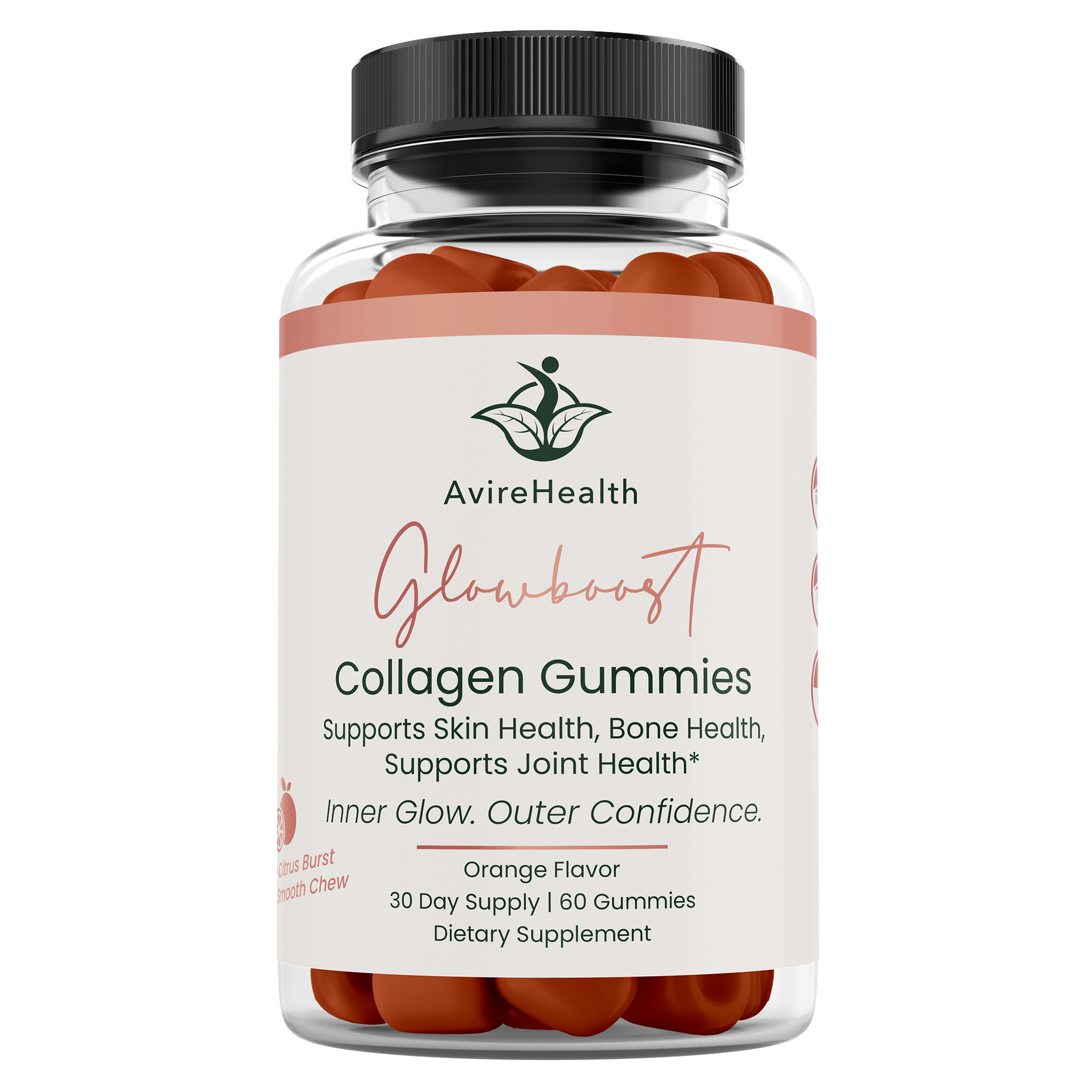 Support your body from the inside out with AvireHealth GlowBoost Collagen Gummies — the delicious, orange-flavored way to promote skin health, hair growth, nail strength, joint flexibility, and bone support.