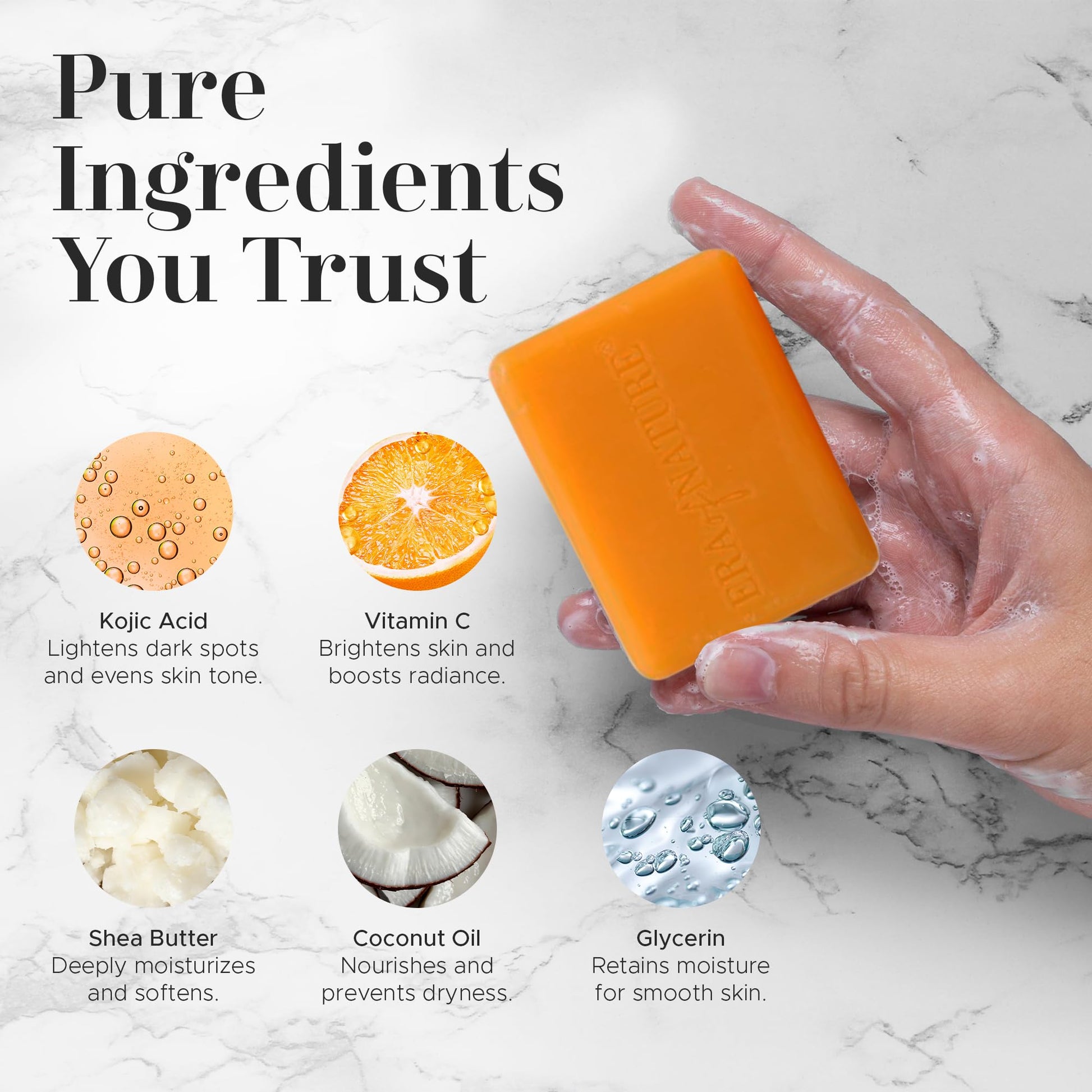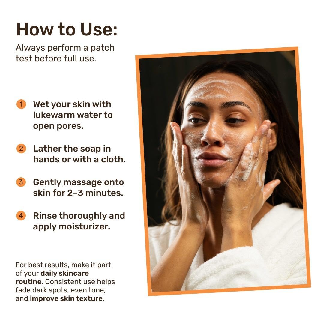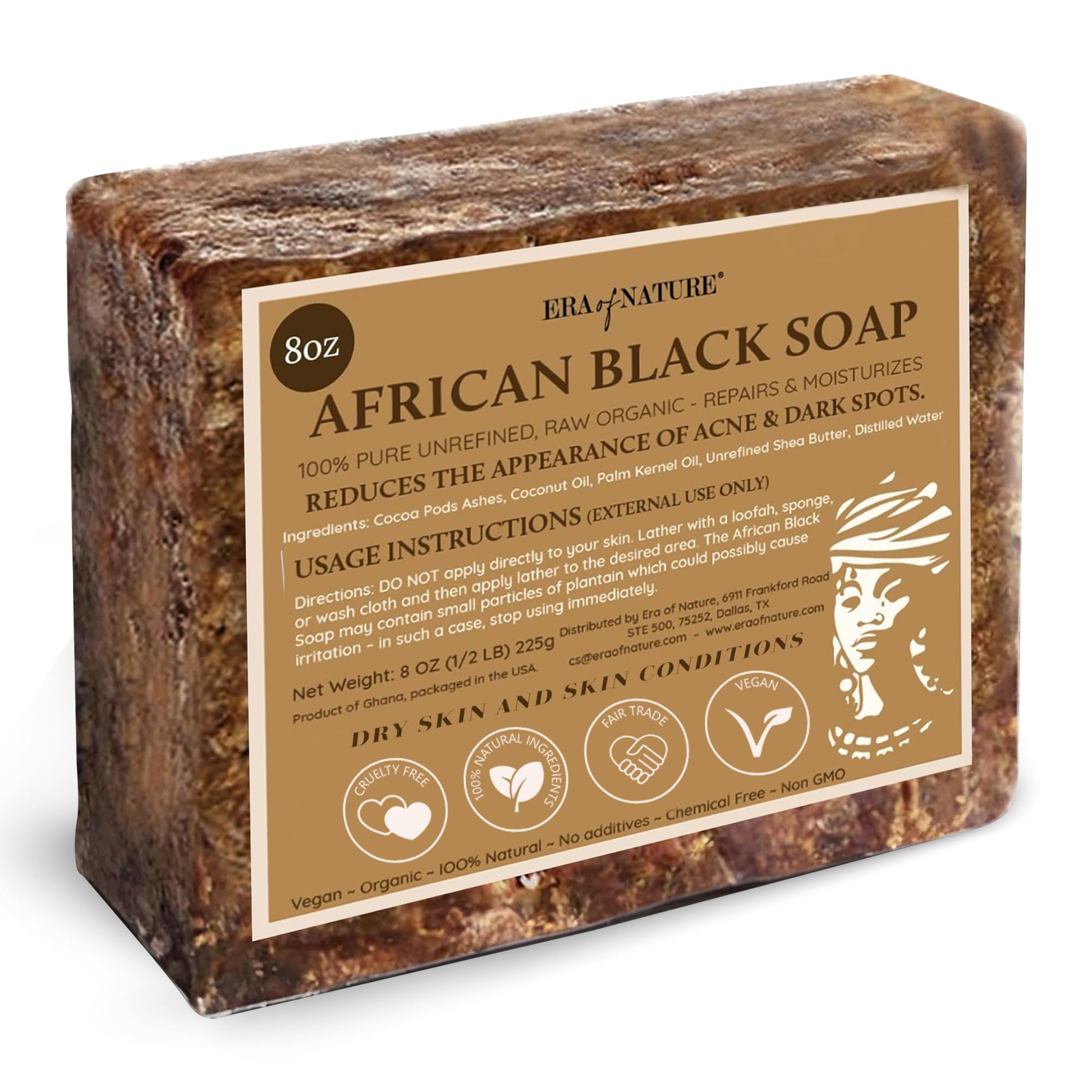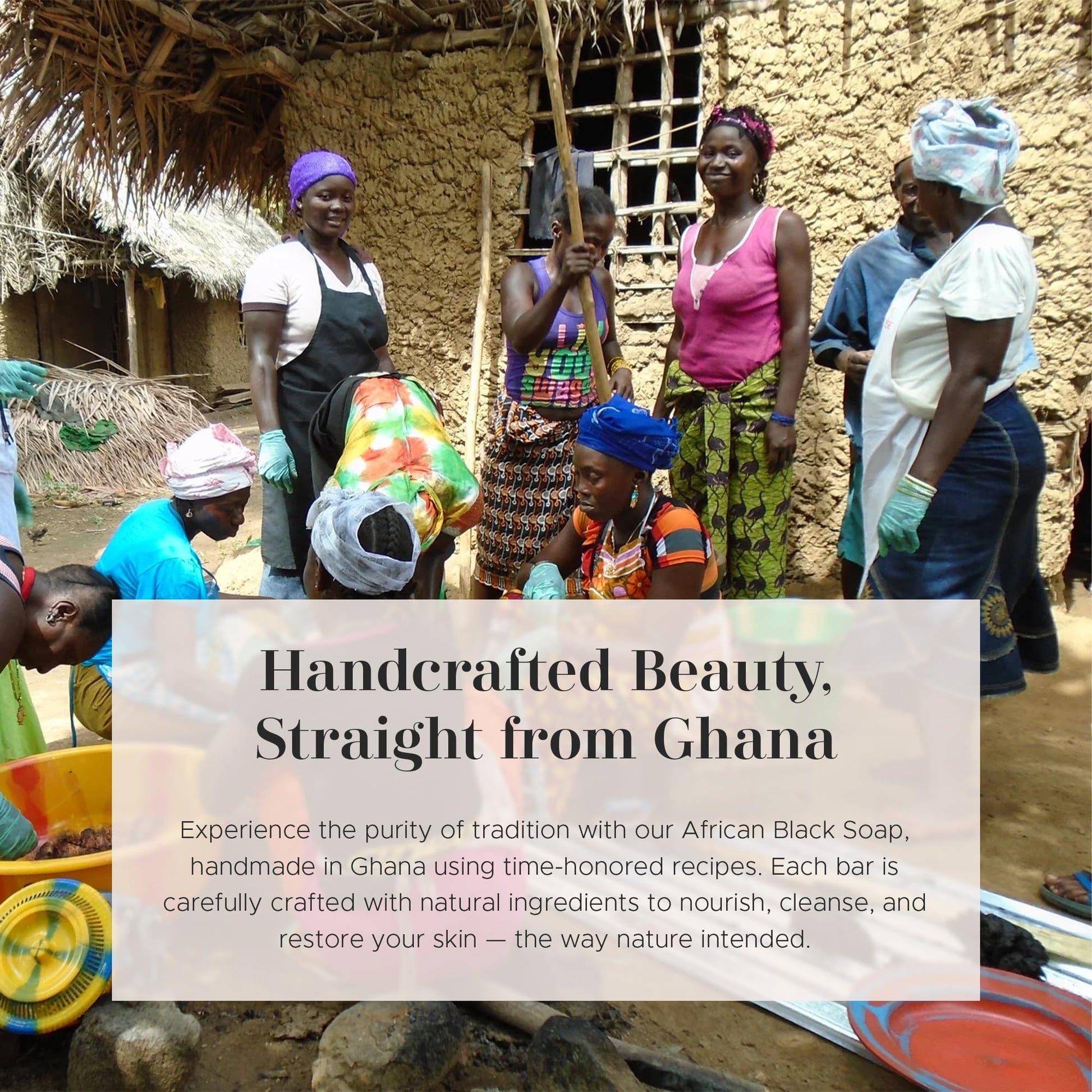 - African Brightening Black Soap is a pure, handmade organic soap crafted in Ghana using traditional methods. Enriched with unrefined shea butter and natural vitamins, it gently cleanses and exfoliates while promoting a brighter, more youthful complexion. One generous 1 lb block lasts for months. Vegan, cruelty-free, and ideal for sensitive or aging skin.